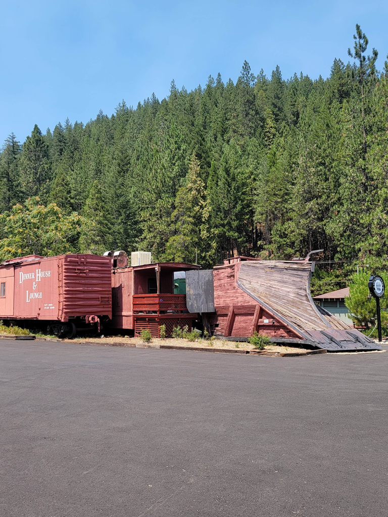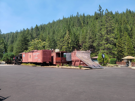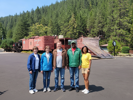 "Family at Railroad Park in Dunsmuir, Ca, cinematic photorealistic, mood: relaxed and weekend tone, highly detailed, professional quality, 8k resolution, There are five people to be rendered into the reference image. I will label them characters 0-4 from left to right and then describe them.
