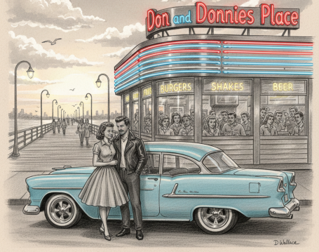 At the right is an image of a restaurant in my area. This is the reference image I used to create the rendering of 5 characters that would be earmarked for face swaps. You can see the complete images below. Here is the prompt created in Lunera that created this: